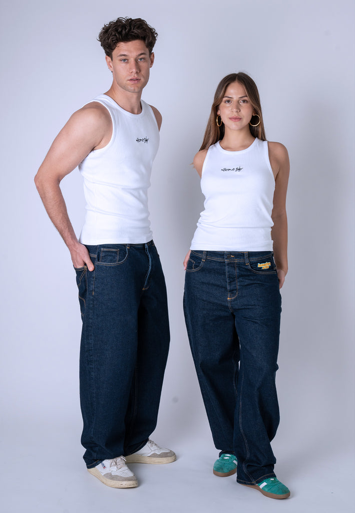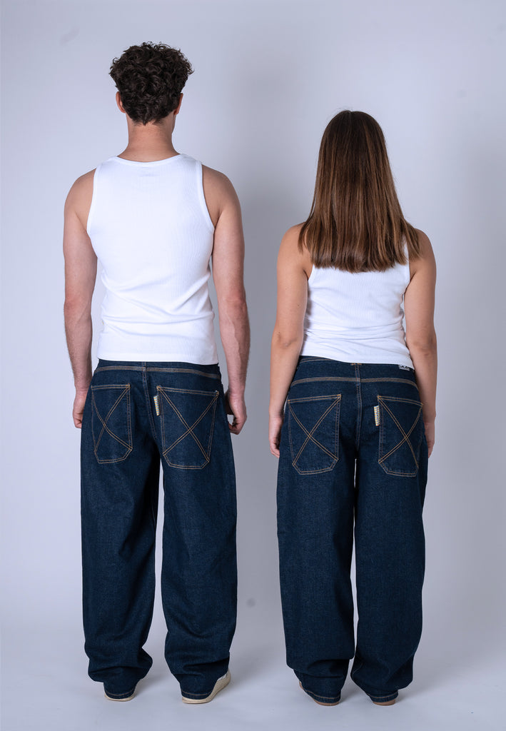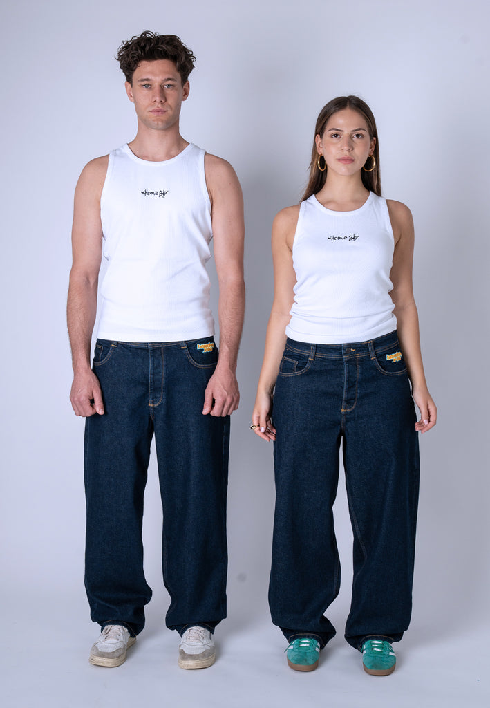 Our baggy jeans have a classic look, as we faithfully reproduced the key details from the denim trousers of the '90s. These include the multicolored "homeboy x-tra" embroidery under the waistband, the rainbow fly tab, and the X embroidery on the back pocket. The back pocket is also cut a bit lower, just like back then, giving the trousers an additional loose-fit look.