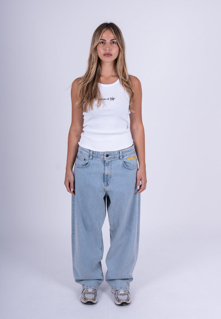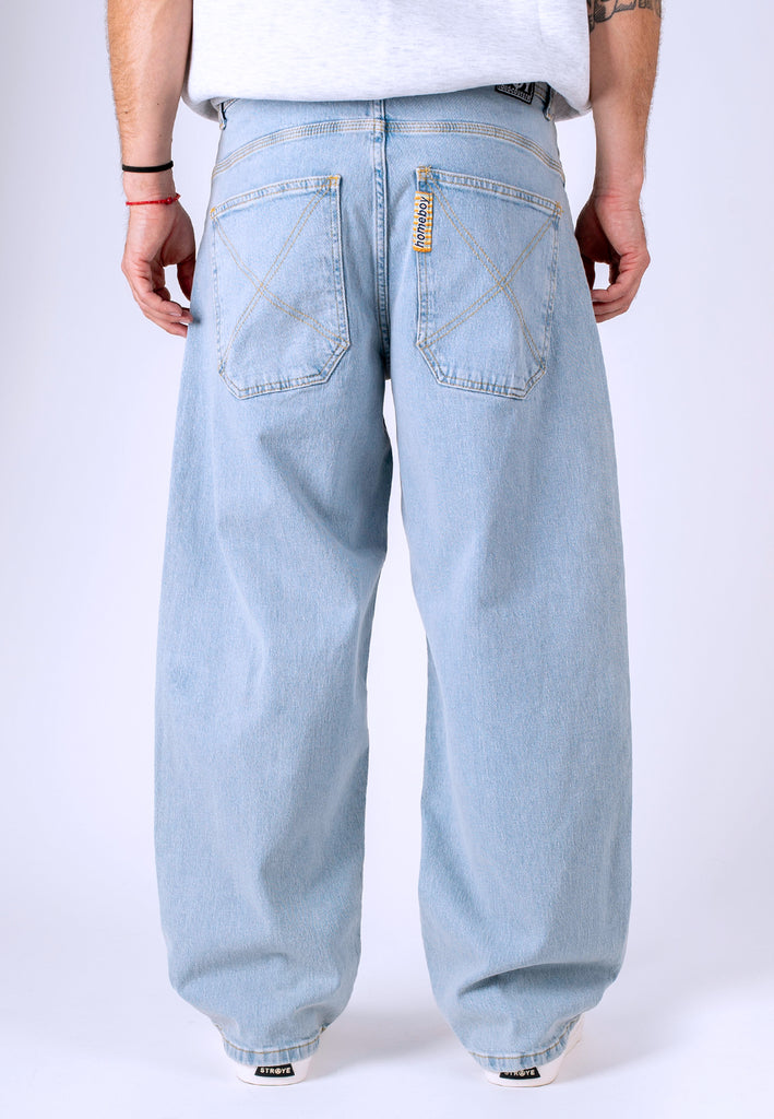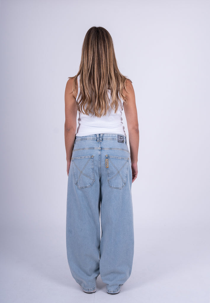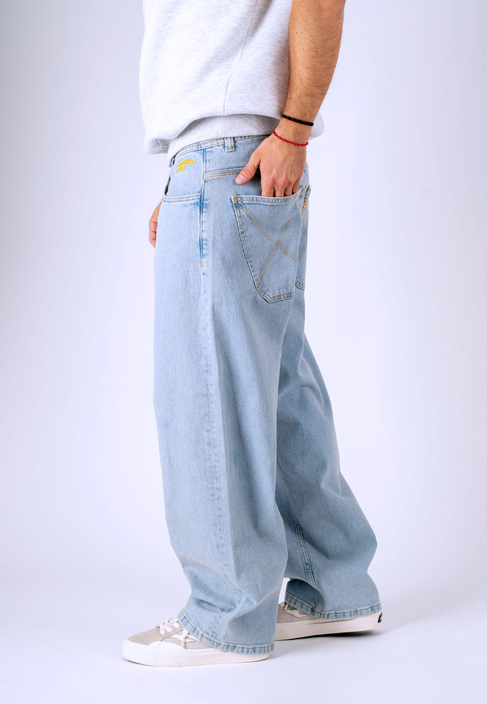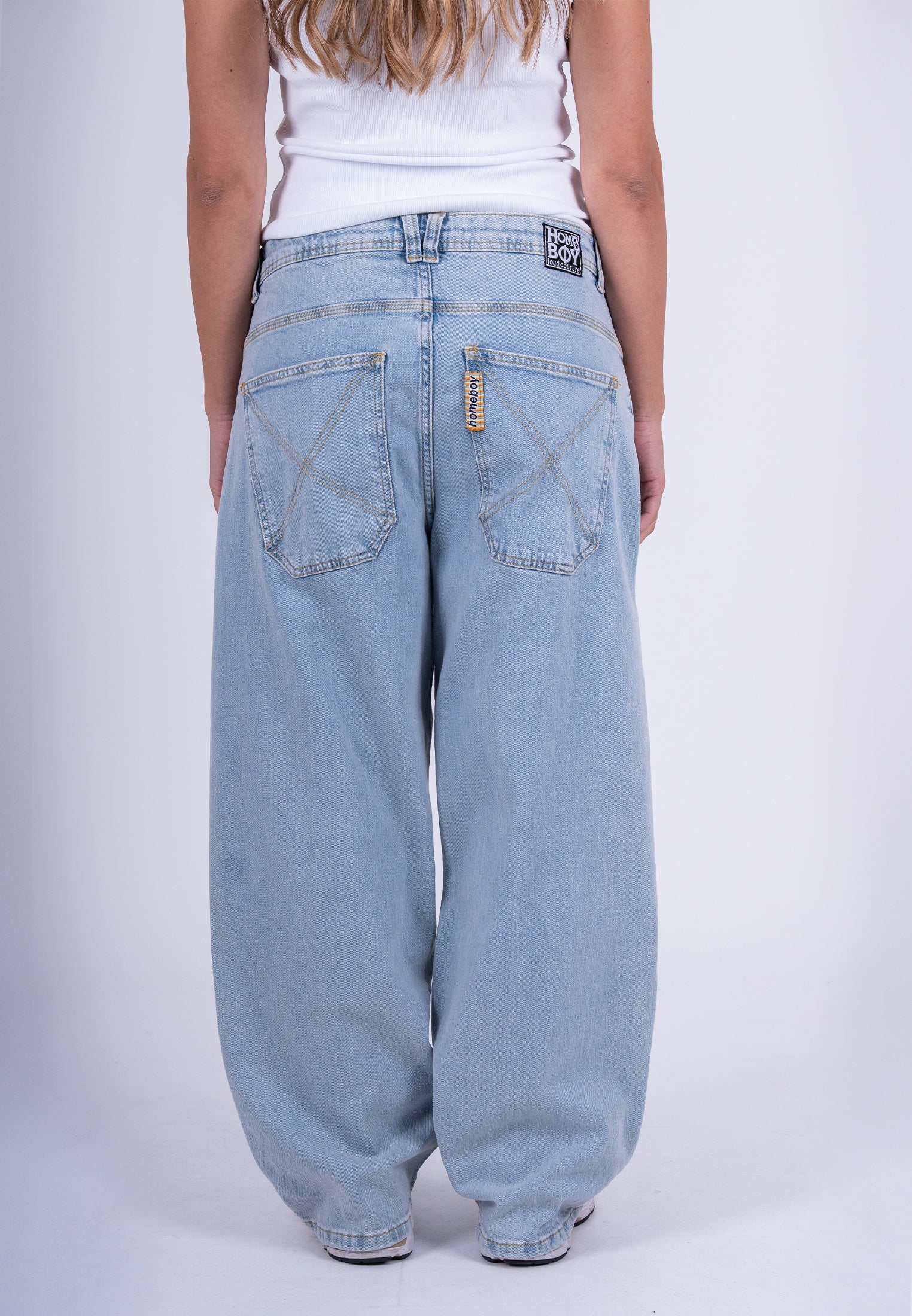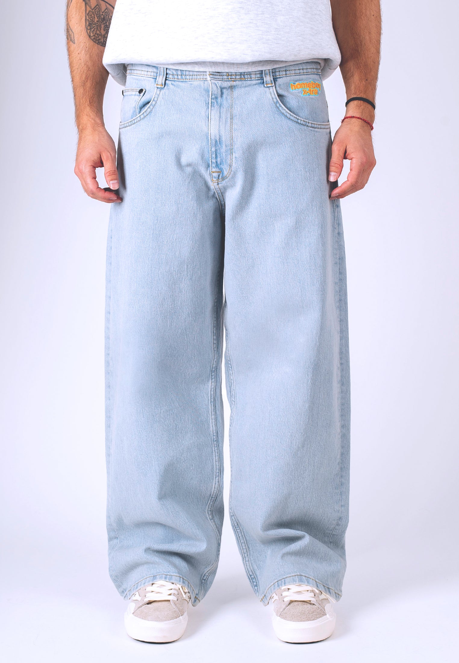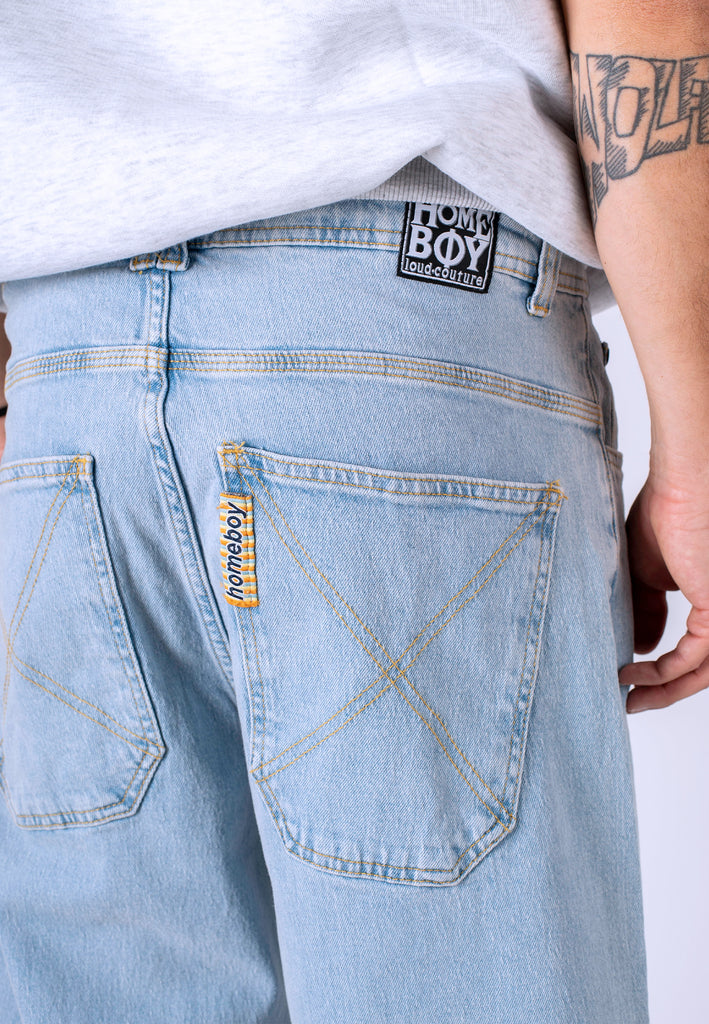 Our baggy jeans have a classic look, as we faithfully reproduced the key details from the denim trousers of the '90s. These include the multicolored "homeboy x-tra" embroidery under the waistband, the rainbow fly tab, and the X embroidery on the back pocket. The back pocket is also cut a bit lower, just like back then, giving the trousers an additional loose-fit look.
