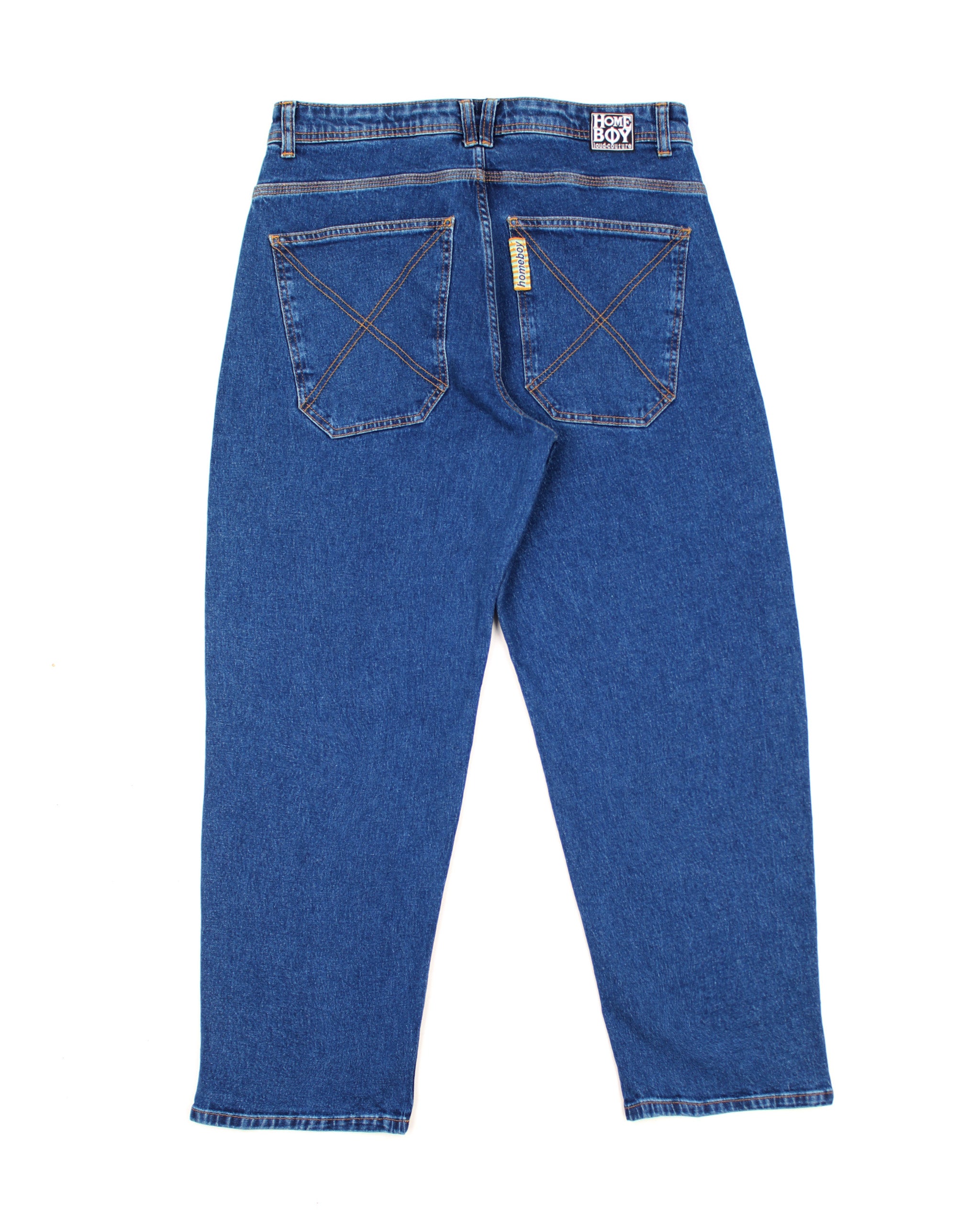 Our baggy jeans have a classic look, as we faithfully reproduced the key details from the denim trousers of the '90s. These include the multicolored "homeboy x-tra" embroidery under the waistband, the rainbow fly tab, and the X embroidery on the back pocket. The back pocket is also cut a bit lower, just like back then, giving the trousers an additional loose-fit look.