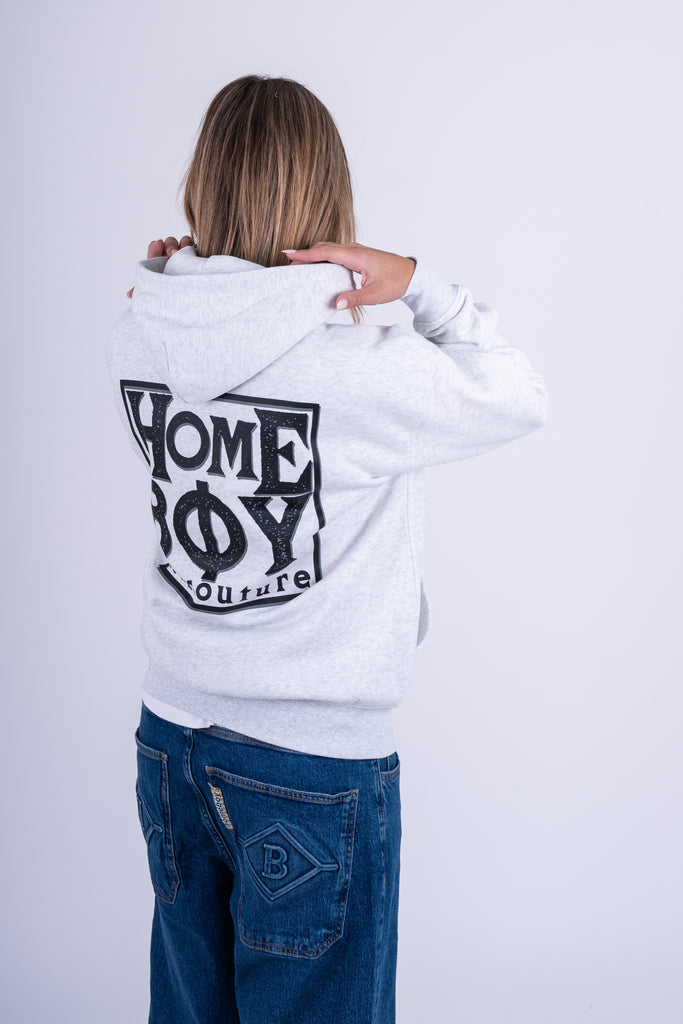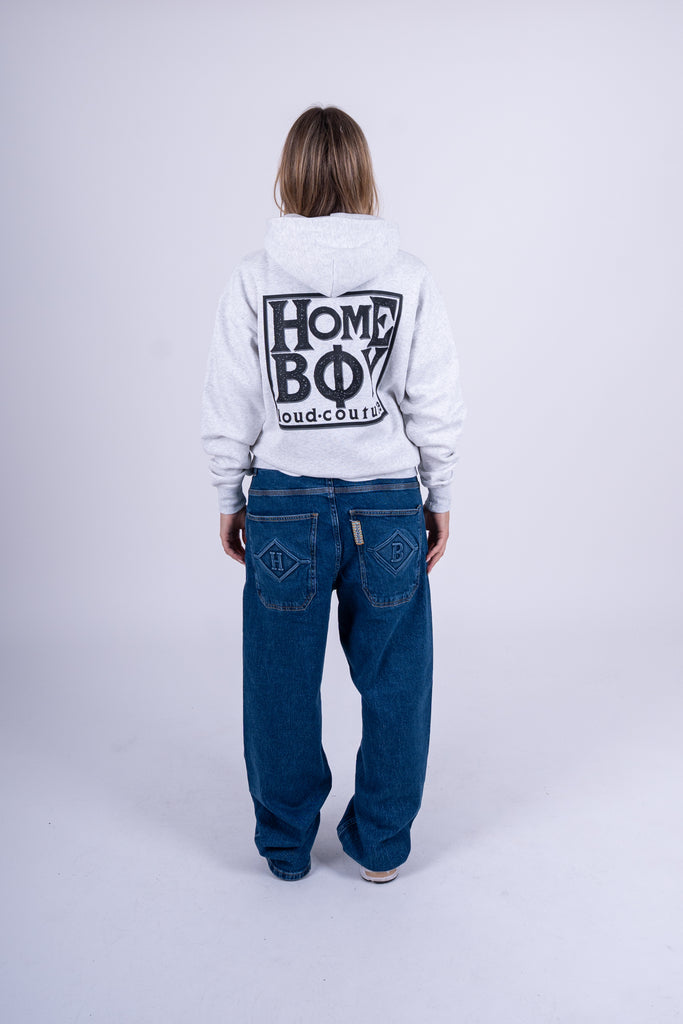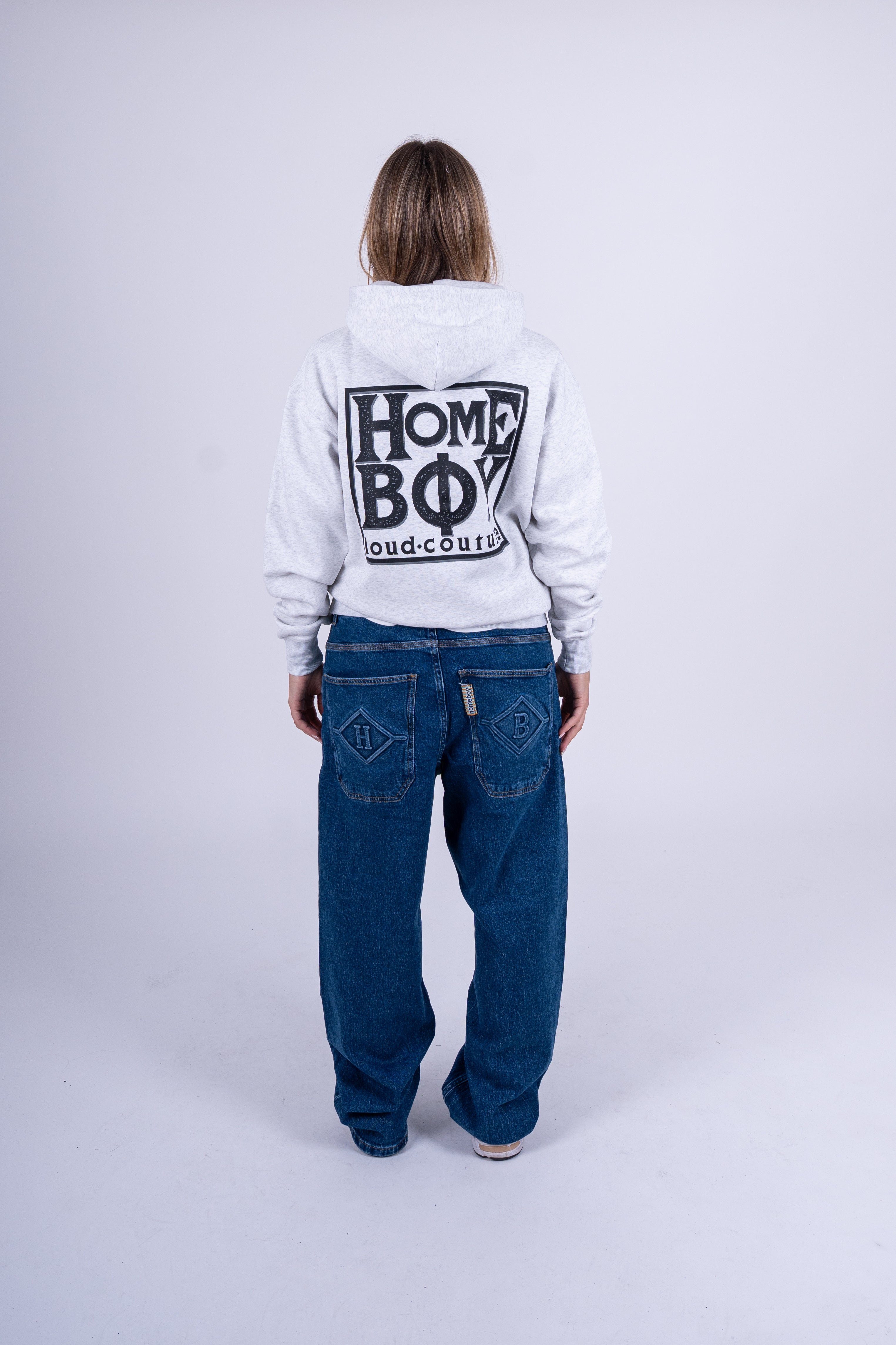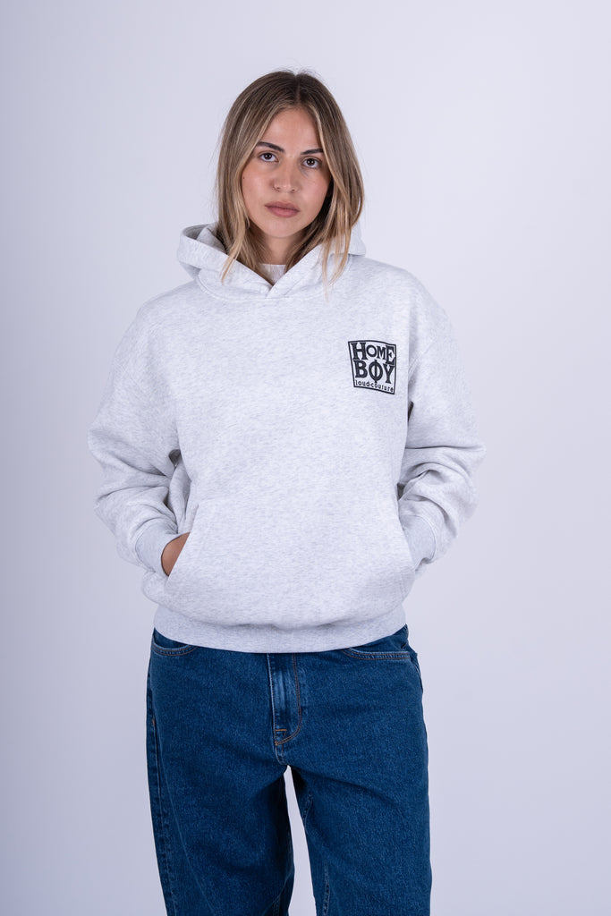 This hoodie has been with our brand since day one. The old-school logo was designed in 1988 and then enlarged on a photocopier until it achieved its iconic ripped texture. Do you recognize the small dots in the letters? Back then, it was printed on the first sweatshirts and T-shirts and defined Homeboy like no other logo. Now, 33 years later, you can find it on our oversized hoodie.